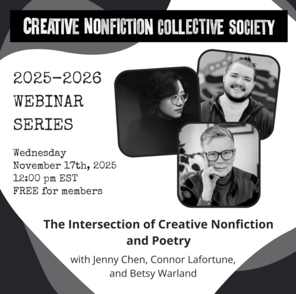 On November 26 at 10 AM MT / 12 PM ET, I’ll be joining Jenny Chen and Connor Lafortune for The Intersection of Creative Nonfiction and Poetry, a live conversation hosted by the Creative Nonfiction Collective Society.