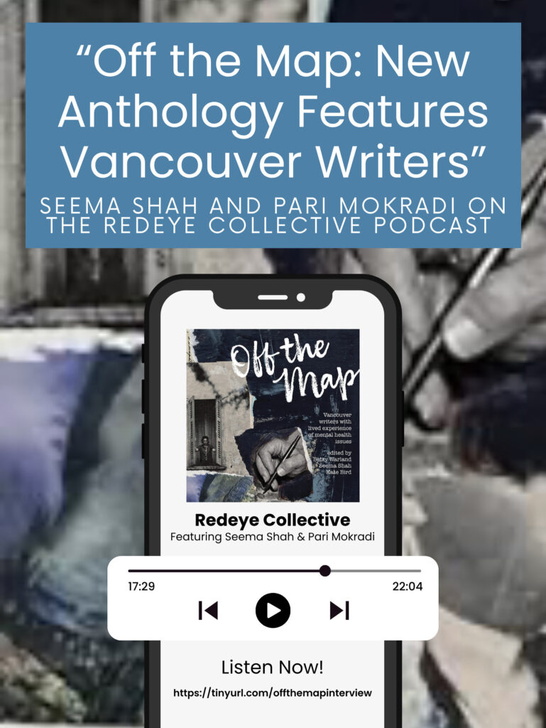 I’m delighted to share that OFF THE MAP was recently featured on the Redeye Collective podcast. In this episode, co-editor Seema Shah and contributor Pari Mokradi talk about the anthology’s path to publication and its focus on Vancouver writers with lived experience of mental health issues.