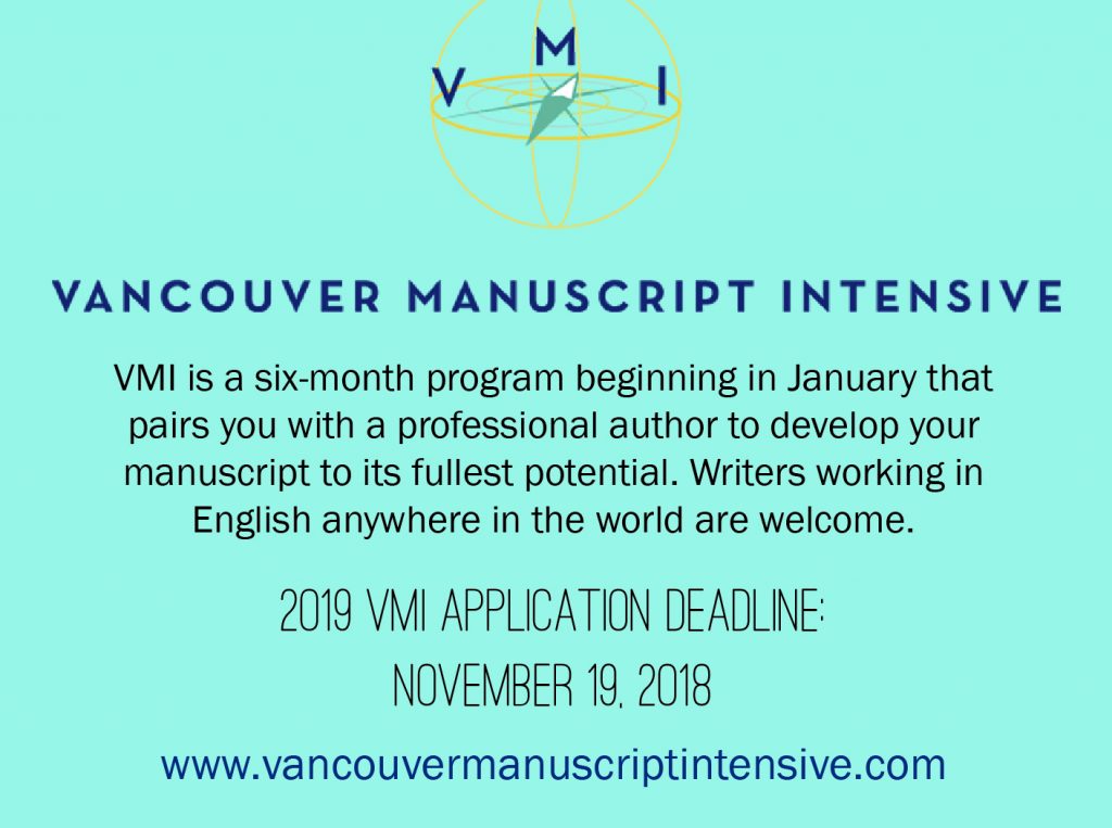 The Vancouver Manuscript Intensive is accepting applications for 2019. VMI is an in-depth one-to-one mentorship program that pairs you with a professional author to develop your manuscript to its fullest potential.